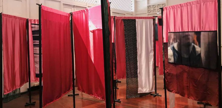 Stand. Move. (A Labyrinth) is an installation that activates a dialogue between site-specificity and the affective demands of space. Developed from Wee’s recent period of residency at Singapore’s Center for Contemporary Art (CCA), the fabric maze of the installation could suggest a theatrical set but also claim an ominous experience of barriers and walls, and, further, possesses a queer sensibility. Accompanying images explore questions of legibility for the phenomenology of navigation and way-finding.